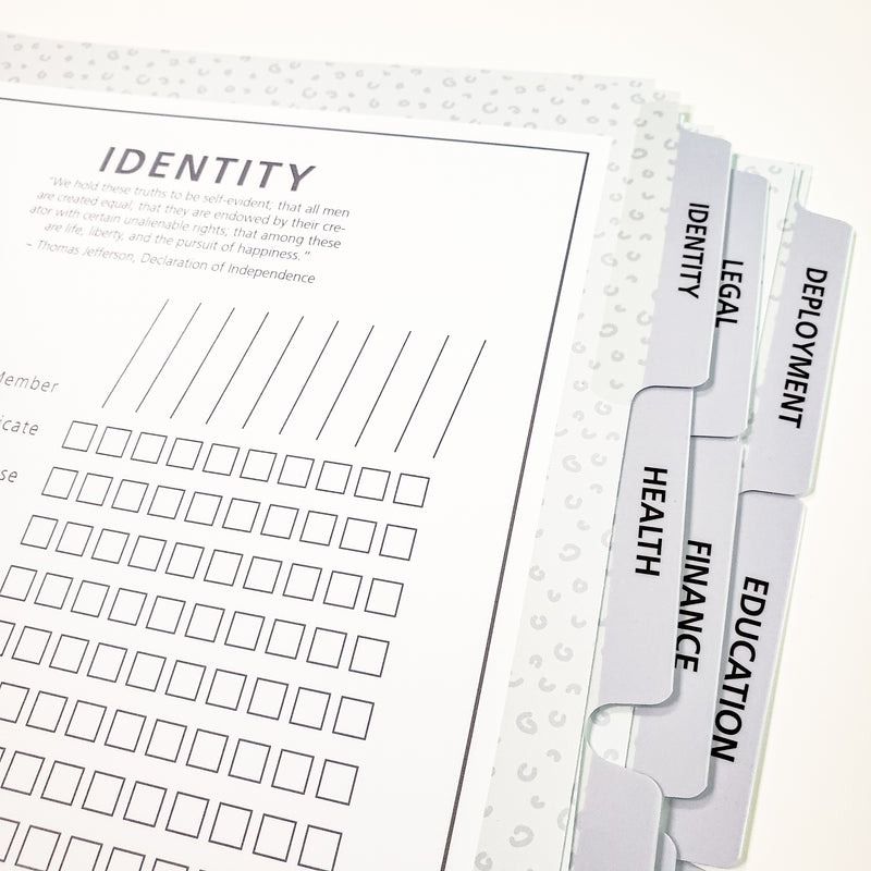 - 12 tab categories: Identity, Health, Housing, Household, Legal, Finance, Vehicles, Emergency, Deployment, Education, Travel, Pets